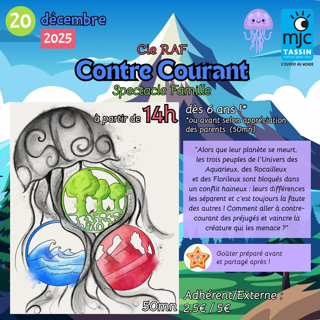 Découvrez « Contre-courant », le spectacle familial de décembre à la MJC ! 🌟 Une escale artistique pleine de surprises à vivre avec vos enfants. Réservez vite vos places pour ce voyage hors du commun !
